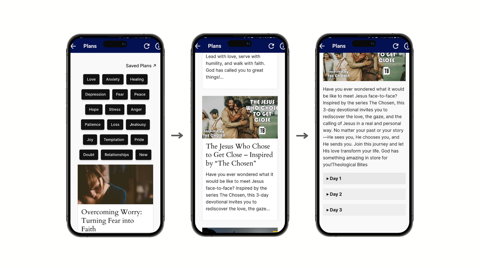 Follow structured reading plans designed for growth, healing, relationships, and purpose.