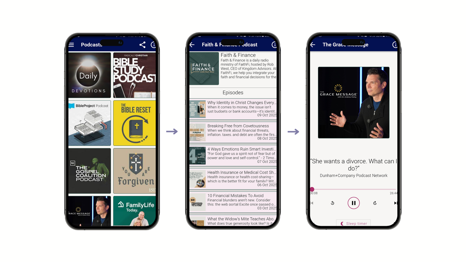 Listen to the Word of God wherever you are — in your car, at work, or during quiet time.
